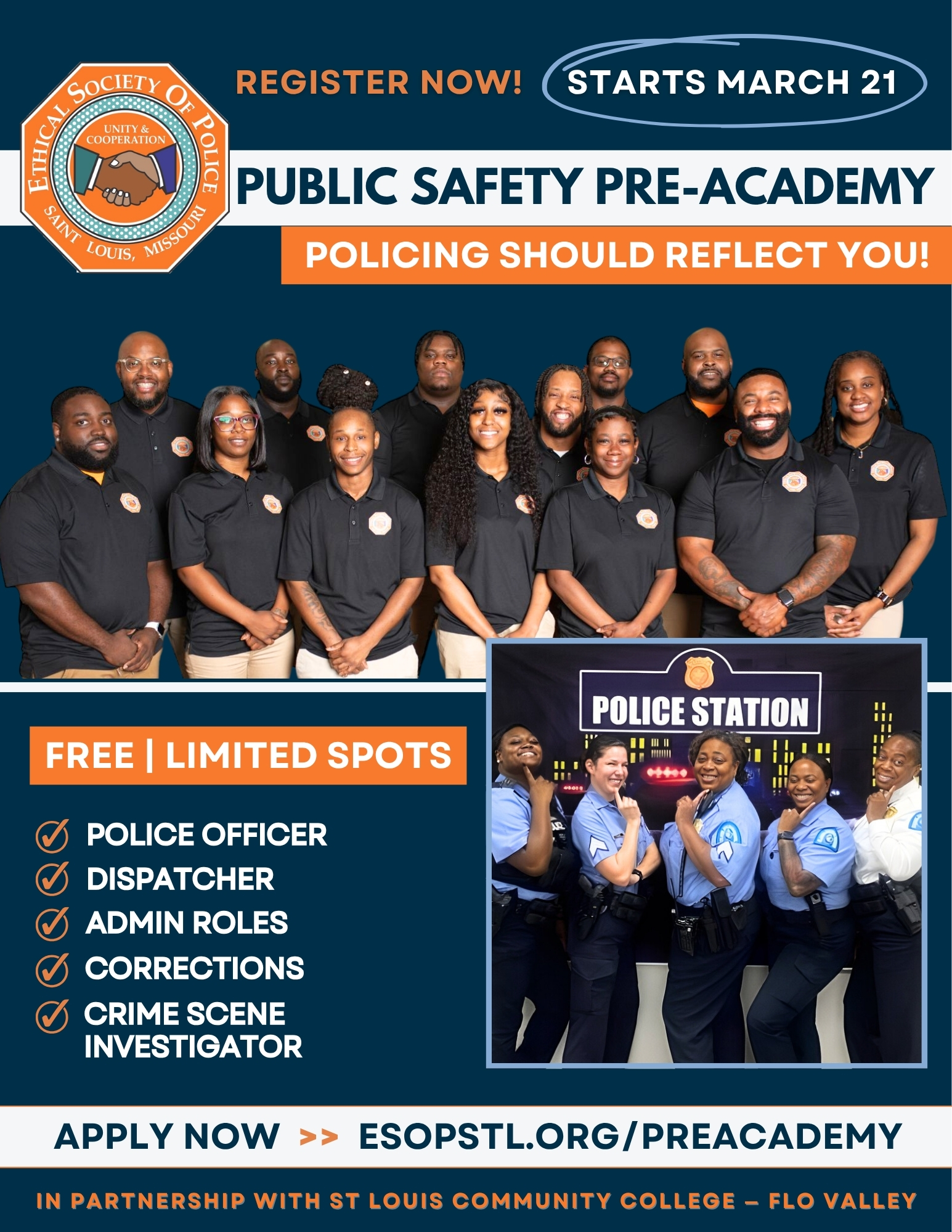 Presented in partnership with the St. Louis Community College/Flo Valley, the next session of the free, 8-week ESOP Public Safety Pre-Academy is designed to support and prepare participants for success in training programs for public safety careers: